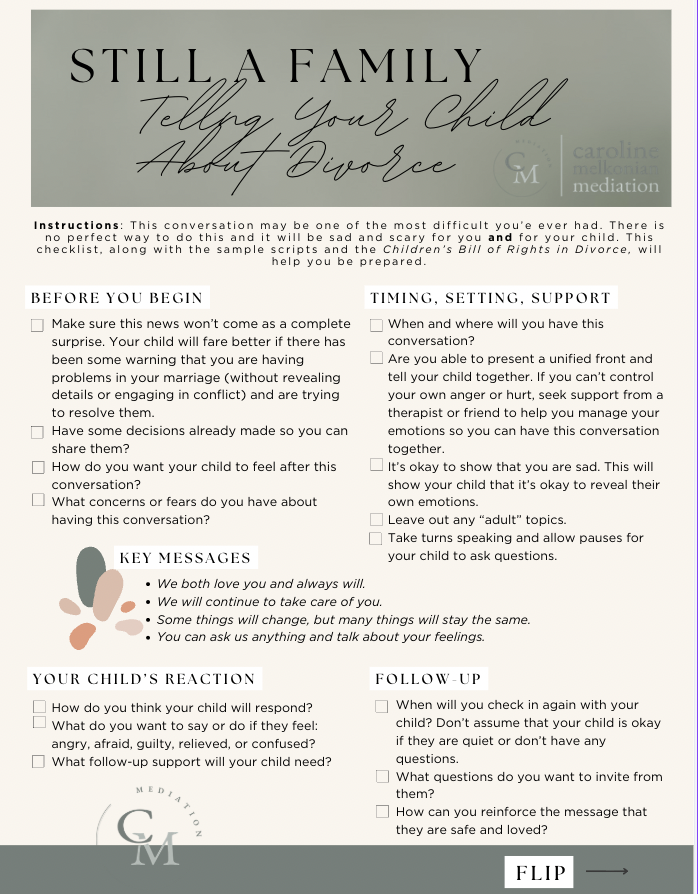 This compassionate, practical guide is designed to help parents prepare for one of the most difficult conversations they'll ever have. It walks you through what to say and how to say it, with age-appropriate sample scripts for children from toddlers through young adults, a preparation checklist covering timing, setting, and follow-up, and the Children's Bill of Rights in Divorce — so you can approach this moment with clarity, confidence, and your child's well-being at the center.